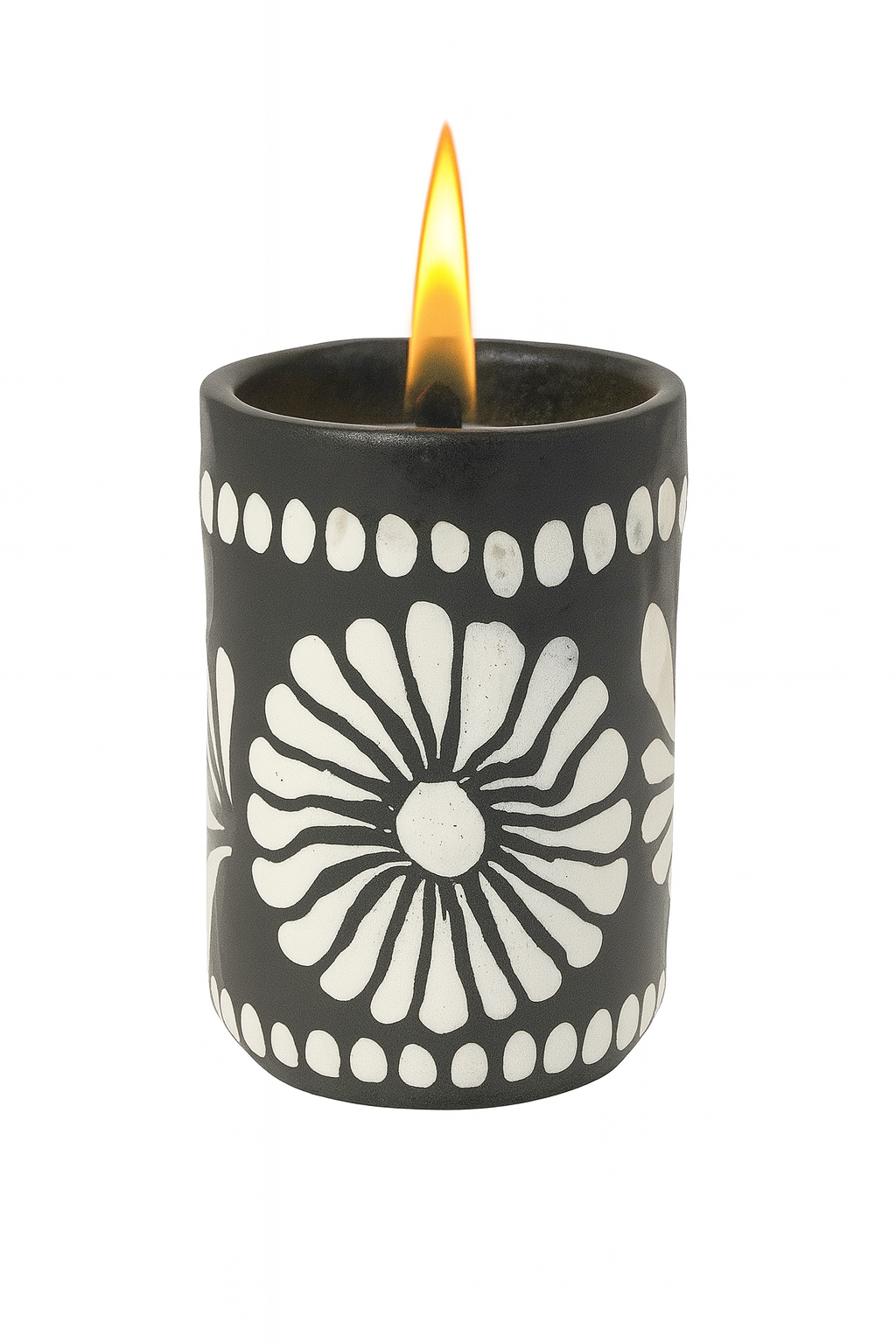 Standing proudly at 5.25” tall and 3” wide, this handcrafted vessel holds approximately 12–14 ounces of pure, slow-burning wax — perfect for hours of warmth and aroma. Each piece carries the spirit of Mexican artistry in every curve and brushstroke.