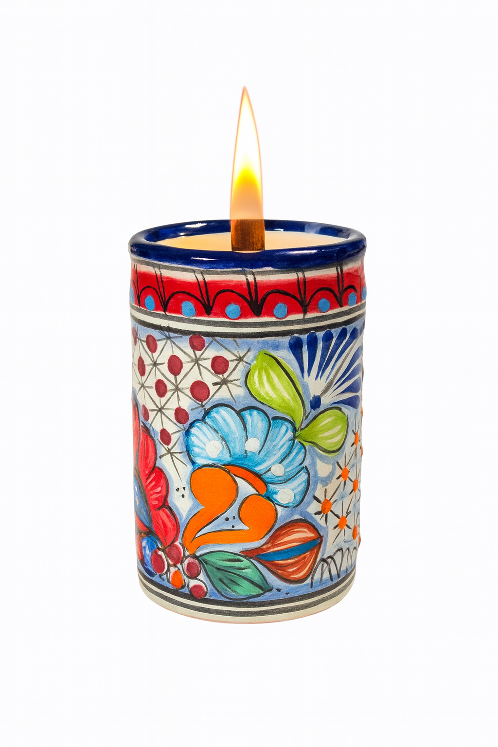 Standing proudly at 5.25” tall and 3” wide, this handcrafted vessel holds approximately 12–14 ounces of pure, slow-burning wax — perfect for hours of warmth and aroma. Each piece carries the spirit of Mexican artistry in every curve and brushstroke.